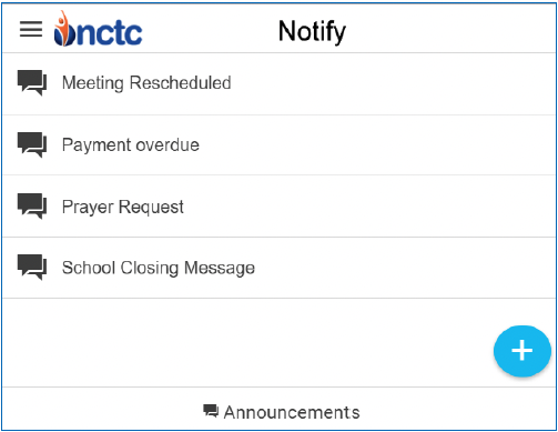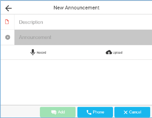 These are recorded messages that you can send to your Phonebook contacts. From the Main Menu, press Announcements to access your current Announcement library.To record a new announcement, press the Blue + button to open the Actions window and select Add Announcement.