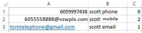 Data in this format needs to be created using three columns: Column A, containing the 10 digit phone number, Email address or text phone number and carrier’s domain name. Column B, can have a description or can be left blank, and Column C, which needs to have the number “0” if it is a phone number and the number “1” if it is an Email address and “2” if it is a text phone number. Use the CSV File type when you Save your Notification contact data.