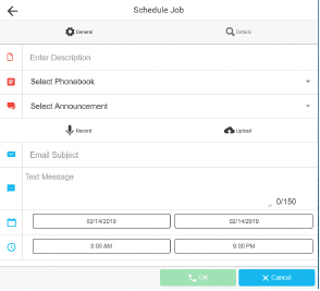 Create a Name for your new Job in the Enter Description field, Select a Phonebook, Select an Announcement, press the Phone button, and your Job will start immediately!Use Upload to add a new announcement for this Job. Once an Announcement has been selected, a Play button will allow you to listen to the Announcement.