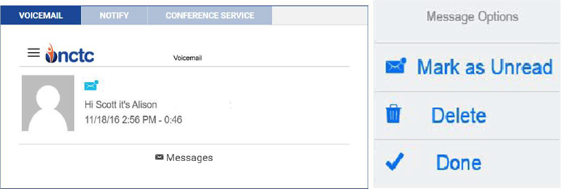 Clicking on Messages will display your voice messages. Calls that result in a new Voice Mail message will have a Blue Envelope icon. If the Voice Mail message has been previously marked as read, it will be displayed with a Black Envelope icon. Clicking on a specific message allows you to listen to the message by clicking the Play button. Clicking on the Envelope icon will allow you to mark a message as Read or Unread. Click on Delete to remove the message. Click Done when you have finished.