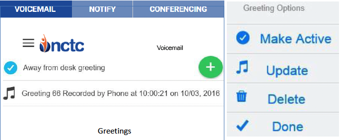 Messages – Displays new and saved messages.Greetings – Displays greetings callers will hear and allows you to change your Active Greeting.