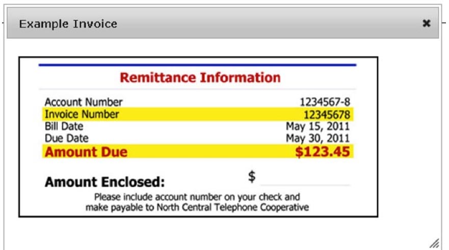 You can click the “What’s This” link to help identify where you can find the Invoice Number and Amount Due on your bill: