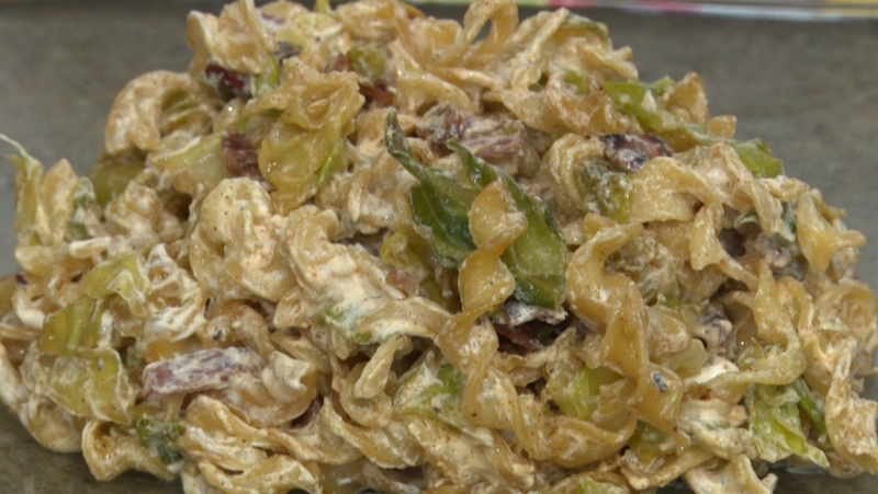 - Crumble bacon and add to cabbage. Stir in noodles.