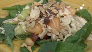 Curried Chicken & Melon Salad Recipe Video Ingredients 3 Oz Sliced Almonds 2 Chicken Breast ¼ to ¾ Tsp Curry Powder 1 ½ Cups Seedless Red Grapes Halved 1 ½ Cups...